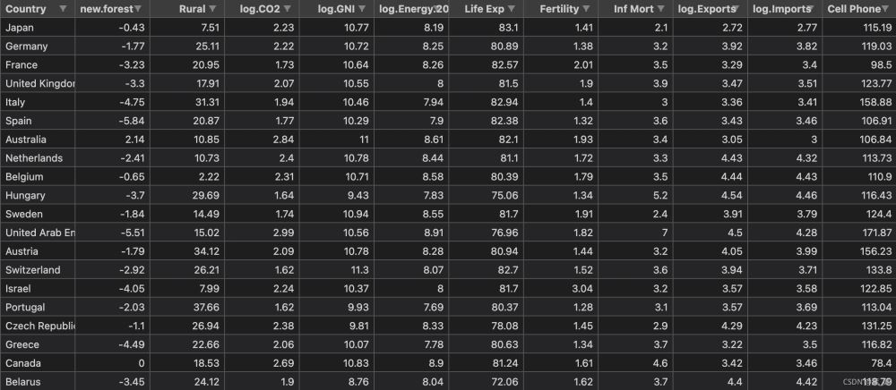 接下來以世界銀行樣本數(shù)據(jù)集進行簡單實現(xiàn)。該數(shù)據(jù)集以標準格式存儲在名為WBClust2013.csv的CSV格式的文件中。其有80行數(shù)據(jù)和14個變量。數(shù)據(jù)來源