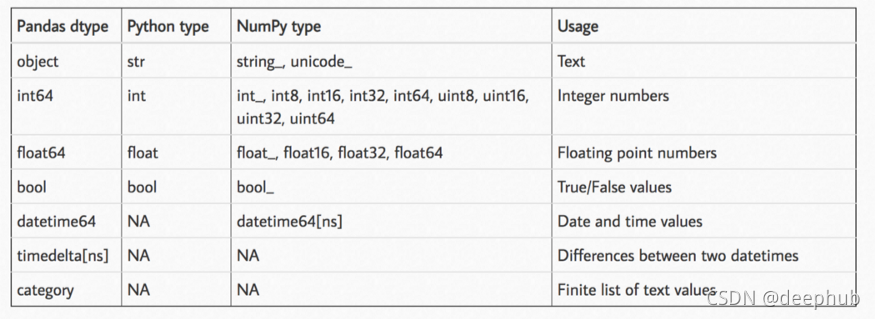 pandas中最糟糕也是最耗內(nèi)存的數(shù)據(jù)類型是 object,這也恰好限制了 Pandas 的一些功能。 剩下的我們還有浮點數(shù)和整數(shù)。 以下這張表是pandas的所有類型: