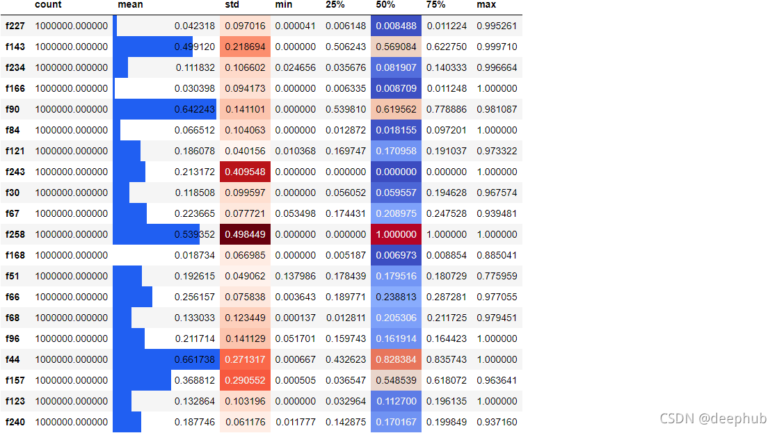 我們隨機選擇 20 列,為它們創(chuàng)建一個 5 位數(shù)的匯總,并轉(zhuǎn)置結(jié)果,根據(jù)它們的大小為均值、標(biāo)準(zhǔn)差和中值列著色。添加這樣的樣式可以讓我們更輕松地發(fā)現(xiàn)原始數(shù)字中的模式,設(shè)置無需使用其他的可視化庫。