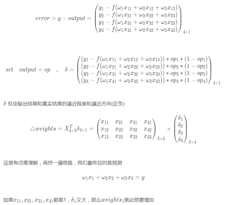 for it in range(10000): z=dot(X,weights) output=1/(1+exp(-z))##'dot' play role of "dot product" error=y-output delta=error*output*(1-output) weights+=dot(X.T,delta)