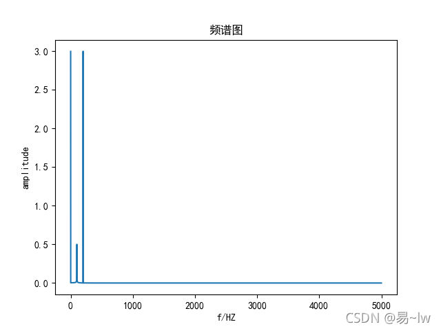 Fs=10000 #采用頻率 L=10000 #采樣點數(shù) t=np.arange(0,L/Fs,1/Fs)#時間序列 y=np.sin(2*np.pi*t*100)*t+3*np.sin(2*np.pi*t*200)+3 #信號序列 f,M=fftlw(Fs,y,1)#快速傅里葉變化并畫頻譜圖