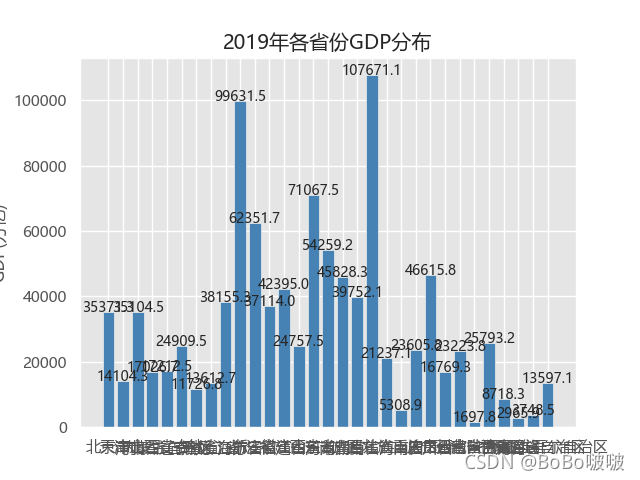2019年各省GDP,這個條形圖效果不是很好,可以對數(shù)據(jù)處理一下,可以一個圖里面少點省份。