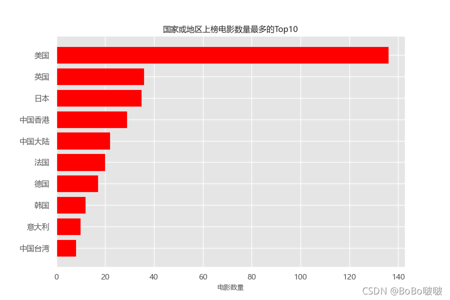 # 取國家或地區(qū)上榜電影數(shù)量最多的前十