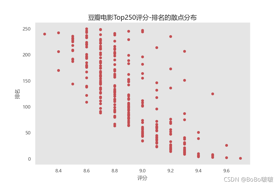 # 豆瓣電影Top250 排名 評分 散點圖描述關(guān)系