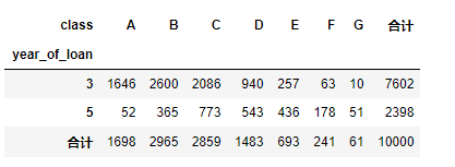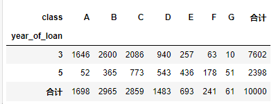 pd.crosstab(train_data['year_of_loan'], train_data['class'], train_data['loan_id'], aggfunc='count',margins = True, margins_name = '合計')