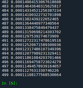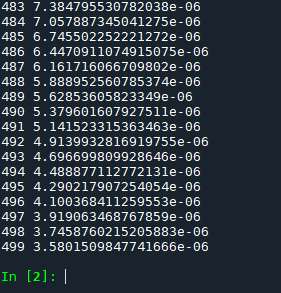 import numpy as np # n是批量大小,d_in是輸入維度 # h是隱藏的維度,d_out是輸出維度 n,d_in,h,d_out=64,1000,100,10 # 創(chuàng)建隨機(jī)輸入和輸出數(shù)據(jù) x=np.random.randn(n,d_in) y=np.random.randn(n,d_out) # 隨機(jī)初始化權(quán)重 w1=np.random.randn(d_in,h) w2=np.random.randn(h,d_out) learning_rate=1e-6 for i in range(500): #前向傳播,計(jì)算預(yù)測(cè)值y h=x.dot(w1) h_relu=np.maximum(h,0) y_pred=h_relu.dot(w2) #計(jì)算損失值 loss=np.square(y_pred-y).sum() print(i,loss) #反向傳播,計(jì)算w1和w2對(duì)loss的梯度 grad_y_pred=2.0*(y_pred-y) grad_w2=h_relu.T.dot(grad_y_pred) grad_h_relu=grad_y_pred.dot(w2.T) grad_h=grad_h_relu.copy() grad_h[h<0]=0 grad_w1=x.T.dot(grad_h) # 更新權(quán)重 w1-=learning_rate*grad_w1 w2-=learning_rate*grad_w2