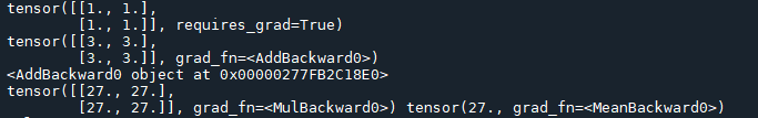 import torch # 創(chuàng)建一個張量,設(shè)置requires_grad=True x=torch.ones(2,2,requires_grad=True) print(x) # 針對張量操作 y=x+2 print(y) print(y.grad_fn)#y作為操作的結(jié)果被創(chuàng)建,所以他有g(shù)rad_fn # 對y操作 z=y*y*3 out=z.mean() print(z,out)