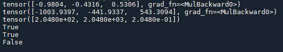 # 雅克比向量積 x=torch.randn(3,requires_grad=True) y=x*2 print(y) while y.data.norm()<1000: y=y*2 print(y)#此時y不是標量,torch.autograd 不能夠直接計算整個雅可比,但是如果我們只想要雅可比向量積,只需要簡單的傳遞向量給 backward 作為參數(shù) v=torch.tensor([0.1,1.0,0.0001],dtype=torch.float) y.backward(v) print(x.grad) print(x.requires_grad) print((x**2).requires_grad) # 使用一下語句停止從跟蹤歷史中.require_gra=True的張量自動求導(dǎo) with torch.no_grad(): print((x**2).requires_grad)