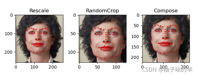 #%% scale=Rescale(256) crop=RandomCrop(128) composed=transforms.Compose([Rescale(256),RandomCrop(224)]) # 在樣本上應(yīng)用上述變換 fig=plt.figure() sample=face_dataset[65] for i,tsfrm in enumerate([scale,crop,composed]): transformed_sample=tsfrm(sample) ax=plt.subplot(1,3,i+1) plt.tight_layout() ax.set_title(type(tsfrm).__name__) show_landmarks(**transformed_sample) plt.show()