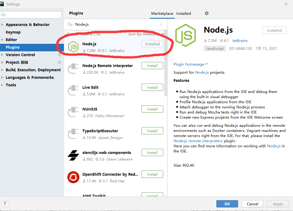 1.點(diǎn)開setting,在Plugins中搜索node.js(安裝less之前得安裝node.js),安裝成功后關(guān)閉重新打開pycharm。
