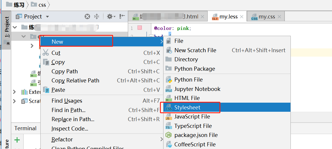 5、測(cè)試在pycharm中創(chuàng)建less文件并使用: