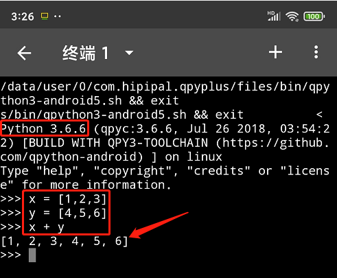 單機“終端”,就會出現(xiàn)如下界面。從下圖我們可以看到Python的版本為3.6.6,接著我們還寫了一個列表拼接的代碼。