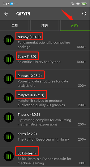 點擊“QPYPI”,在點擊“AIPY”,可以看到下方有很多我們經(jīng)常使用的庫,需要什么庫,我們就下載哪一個。