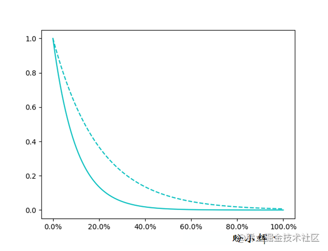 import numpy as np import matplotlib.pyplot as plt import matplotlib.ticker as ticker def make_label(value, pos): return '%0.1f%%' % (100. * value) ax = plt.axes() ax.xaxis.set_major_formatter(ticker.FuncFormatter(make_label)) x = np.linspace(0, 1, 256) plt.plot(x, np.exp(-10 * x), c ='c') plt.plot(x, np.exp(-5 * x), c= 'c', ls = '--') plt.show()