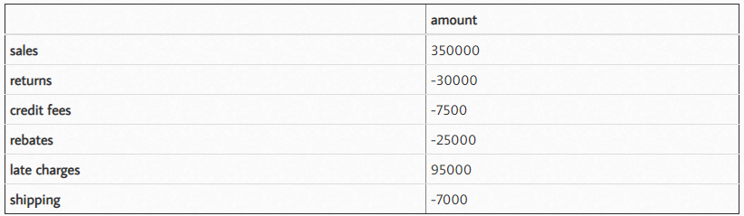 index = ['sales','returns','credit fees','rebates','late charges','shipping']