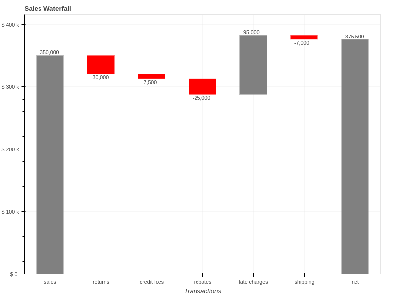 TOOLS = "box_zoom,reset,save" source = ColumnDataSource(df) p = figure(tools=TOOLS, x_range=list(df.index), y_range=(0, net+40000), plot_width=800, title = "Sales Waterfall")