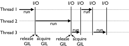 上面這張圖,就是 GIL 在 Python 程序的工作示例。其中,Thread 1、2、3 輪流執(zhí)行,每一個(gè)線程在開(kāi)始執(zhí)行時(shí),都會(huì)鎖住 GIL,以阻止別的線程執(zhí)行;同樣的,每一個(gè)線程執(zhí)行完一段后,會(huì)釋放 GIL,以允許別的線程開(kāi)始利用資源。