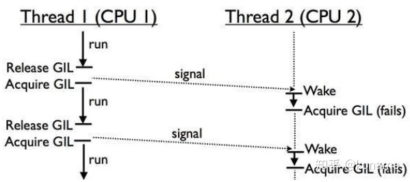 Thread1在CPU1上運(yùn)行,Thread2在CPU2上運(yùn)行。GIL是全局的,CPU2上的Thread2需要等待CPU1上的Thread1讓出GIL鎖,才有可能執(zhí)行。如果在多次競(jìng)爭(zhēng)中,Thread1都勝出,Thread2沒(méi)有得到GIL鎖,意味著CPU2一直是閑置的,無(wú)法發(fā)揮多核的優(yōu)勢(shì)。