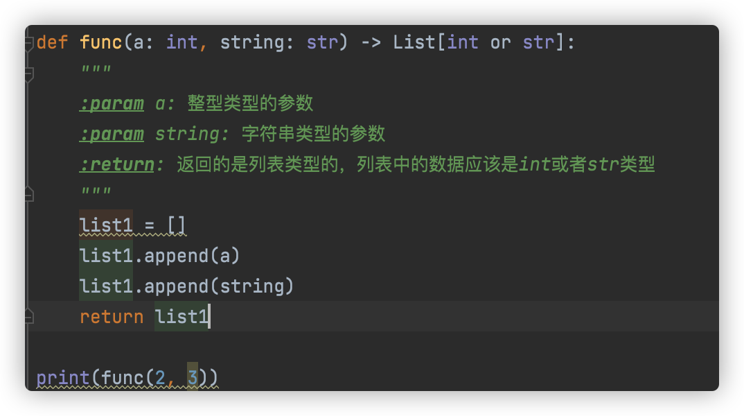 from typing import Union # 指定變量a的類型為int或者str a: Union[int, str] a = 1 print(a) a = [] # 定義了一個列表,pycharm會有黃色警告提示