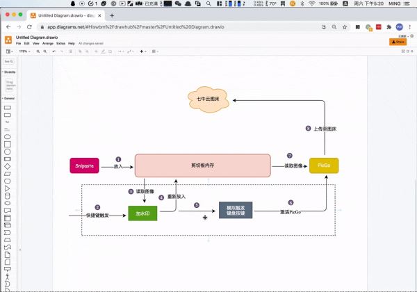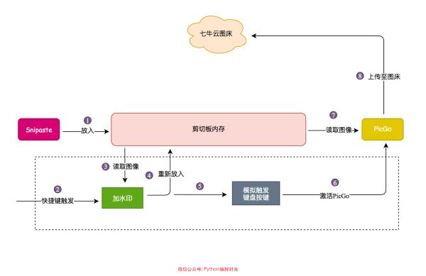 在 Snipaste 將圖像放入剪切板后由我敲入自定義的熱鍵去觸發(fā) Python 腳本去從剪切板中讀取圖像然后使用 PIL 去給該圖像加水印,重新放入剪切板中接著利用 Python 腳本去自動化觸發(fā) PicGo 的快捷鍵PicGo 被激活后,就能將帶有水印的圖片上傳到圖床