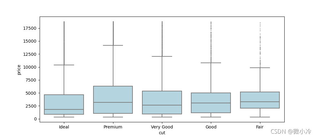 >>> sns.boxplot(x="cut",y="price",data=dia,color='lightblue',fliersize=0.25) >>> plt.show()