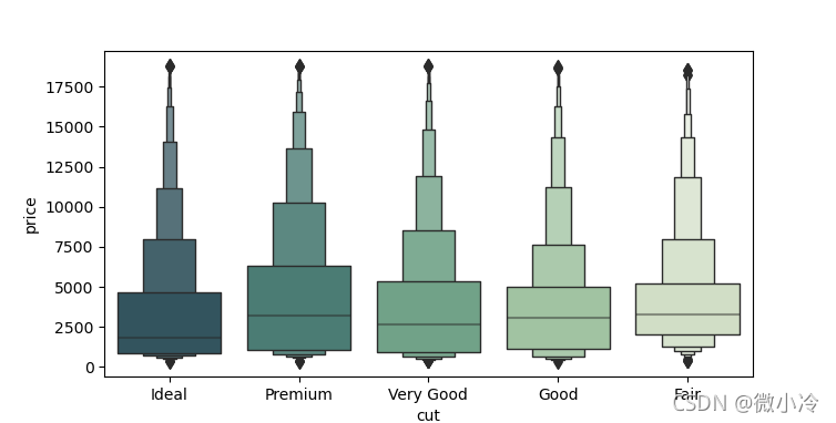 sns.boxenplot(x="cut",y="price",data=dia, palette="ch:rot=-.5,d=.3_r") plt.show()