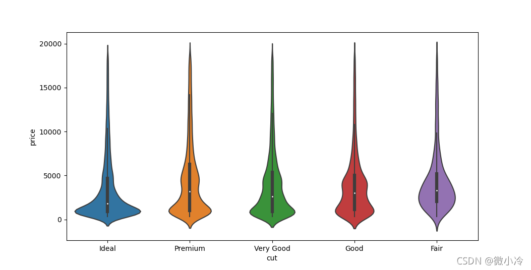 現(xiàn)在我們想知道Premium, Fair, Very Good, Good, Ideal這五種切割方式所對應的價格區(qū)間,那么最直接的想法是做一個箱線圖,就類似K線那種圖。