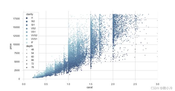 f, ax = plt.subplots(figsize=(6.5, 6.5)) sns.set_theme(style="whitegrid") sns.despine(f, left=True, bottom=True) clarity = ["I1", "SI2", "SI1", "VS2", "VS1", "VVS2", "VVS1", "IF"]#顏色深淺的順序 sns.scatterplot(x="carat", y="price",#聲明x軸和y軸的值 hue="clarity", size="depth", #clarity和depth分別調(diào)控顏色和尺寸 palette="ch:rot=-.2,d=.3_r", #調(diào)色板 style_order=clarity,sizes=(1,10), #顏色標(biāo)識(shí)的順序和尺寸范圍 linewidth=0,data=dia, ax=ax) plt.show()