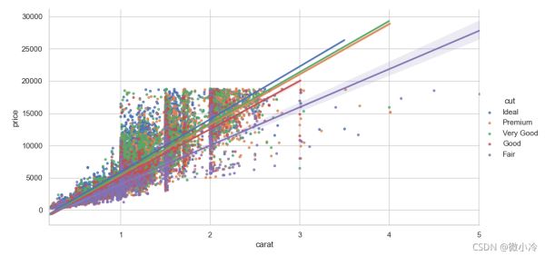 如果想更準(zhǔn)確地觀察cut對(duì)鉆石價(jià)格的影響,可以通過lmplot在散點(diǎn)圖的基礎(chǔ)上繪制一個(gè)趨勢(shì)線出來。