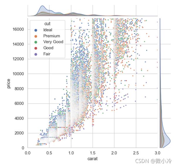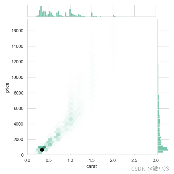 以上諸圖,都是消費(fèi)者最關(guān)心的問題——價(jià)格、尺寸以及透明度等。但商家最關(guān)心的可能是價(jià)格、重量與銷售量的關(guān)系,這就涉及到一個(gè)分布的問題。而seaborn提供了一個(gè)非常好的雙變量關(guān)系圖——jointplot,效果如下