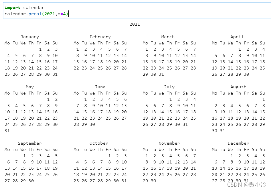 import calendar calendar.prcal(2021,m=4) #2021年,每行4個月