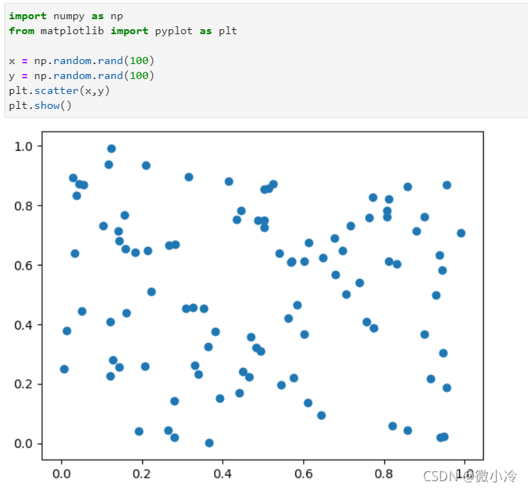 import numpy as np from matplotlib import pyplot as plt x = np.random.rand(100) #python中通過#進行注釋 y = np.random.rand(100) #用于生成100個隨機數(shù) plt.scatter(x,y) #繪制散點圖,并存放在內(nèi)存 plt.show() #調(diào)用內(nèi)存中的圖,show給我們