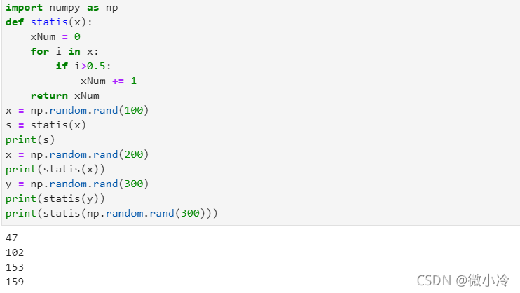 def statis(x): xNum = 0 for i in x: if i>0.5: xNum += 1 return xNum