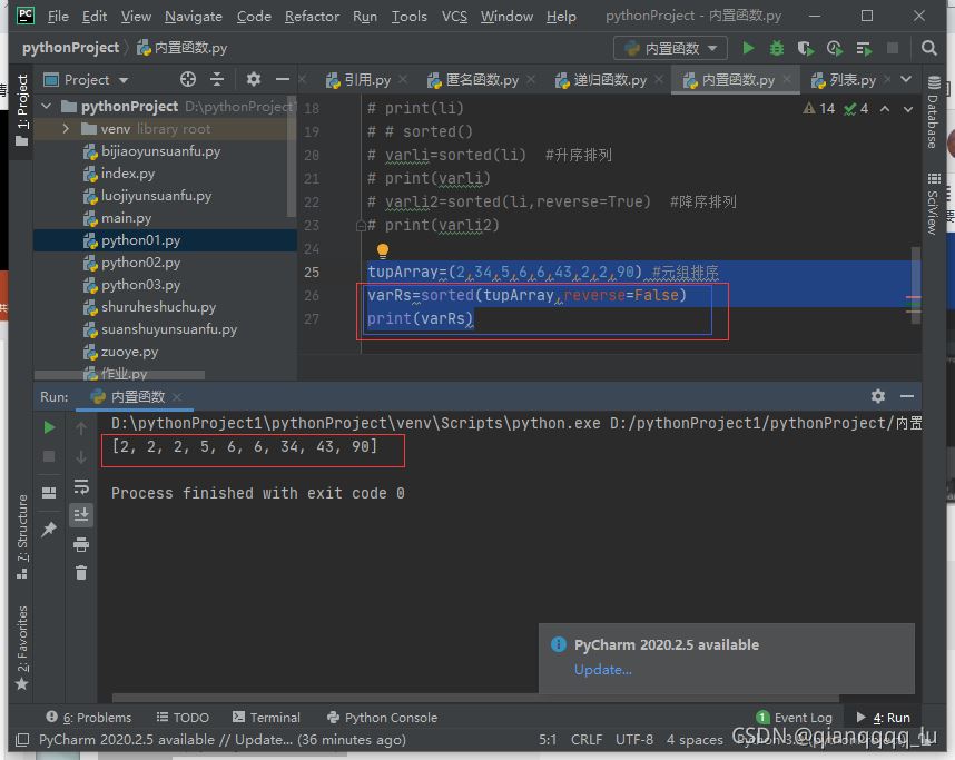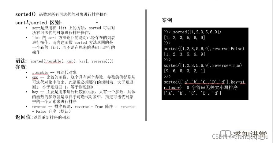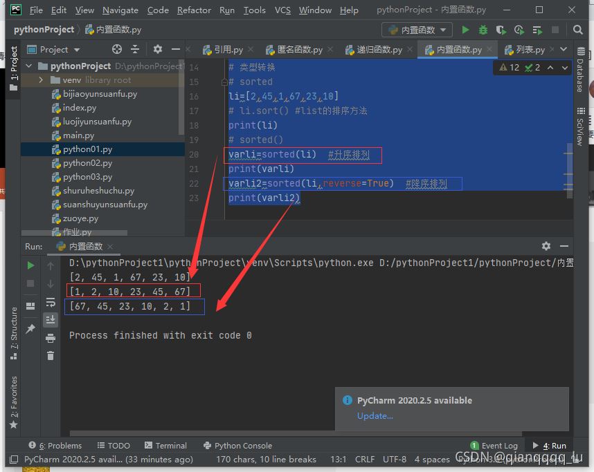 # 類型轉(zhuǎn)換 # sorted li=[2,45,1,67,23,10] # li.sort() #list的排序方法 print(li) # sorted() varli=sorted(li) #升序排列 print(varli) varli2=sorted(li,reverse=True) #降序排列 print(varli2)