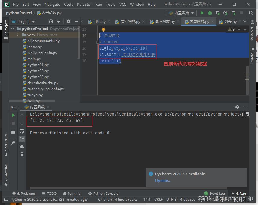 # 類型轉(zhuǎn)換 # sorted li=[2,45,1,67,23,10] li.sort() #list的排序方法 print(li)
