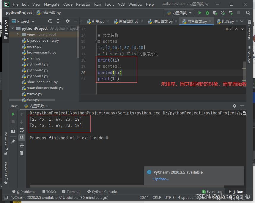 # sorted li=[2,45,1,67,23,10] # li.sort() #list的排序方法 print(li) # sorted() sorted(li) print(li)