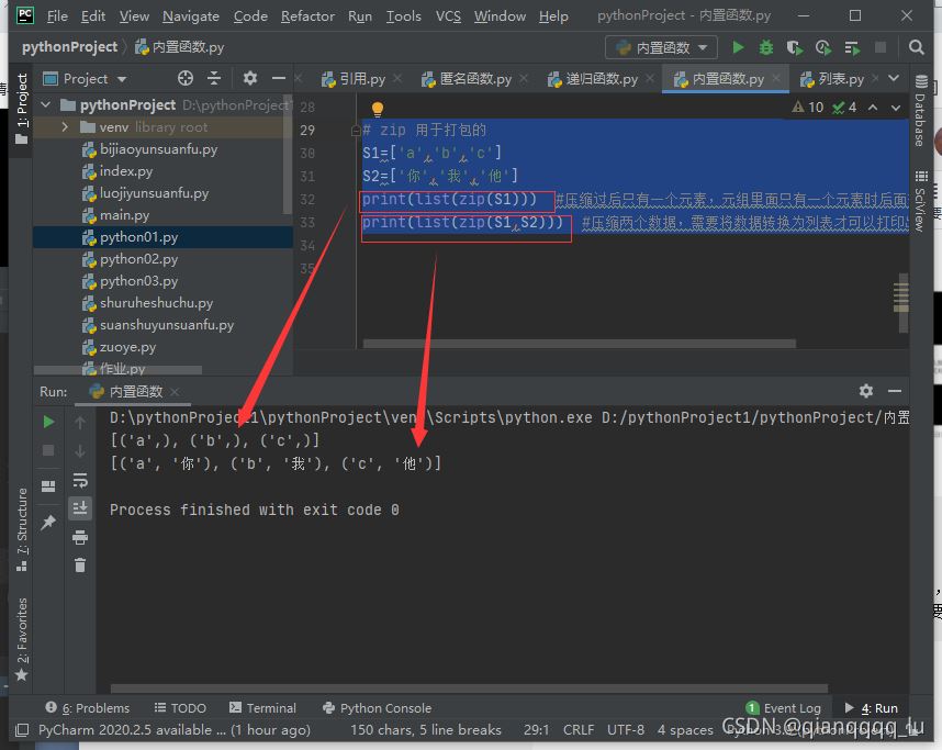 # zip 用于打包的 S1=['a','b','c'] S2=['你','我','他'] print(list(zip(S1))) #壓縮過后只有一個元素,元組里面只有一個元素時后面有一個逗號 print(list(zip(S1,S2))) #壓縮兩個數(shù)據(jù),需要將數(shù)據(jù)轉(zhuǎn)換為列表才可以打印出來 按照索引,會把序列中對應(yīng)的索引位置的元素存儲為一個元組進(jìn)行輸出,若兩個元素個數(shù)不一樣,會按照最少元素進(jìn)行壓縮