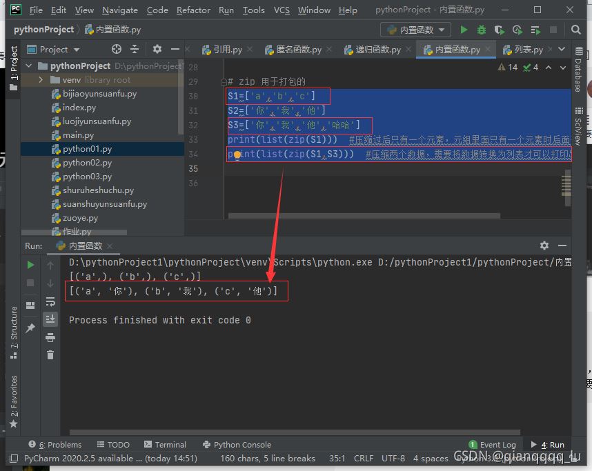 S1=['a','b','c'] S2=['你','我','他'] S3=['你','我','他','哈哈'] print(list(zip(S1))) #壓縮過后只有一個元素,元組里面只有一個元素時后面有一個逗號 print(list(zip(S1,S3))) #壓縮兩個數(shù)據(jù),需要將數(shù)據(jù)轉(zhuǎn)換為列表才可以打印出來