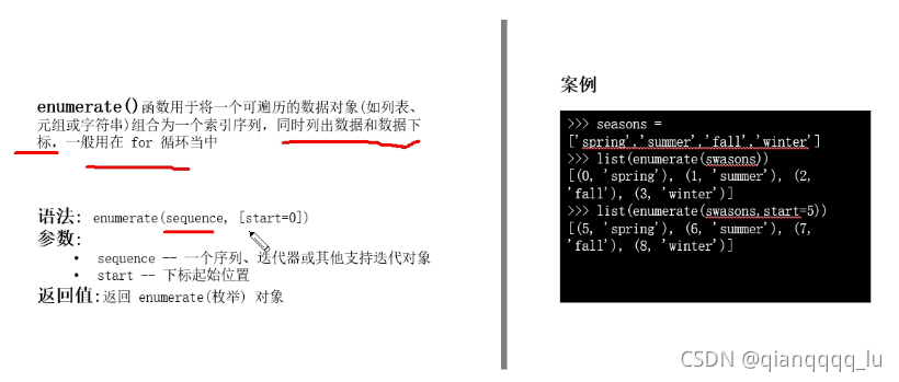 # enumerate listObj=['a','b','c'] #加索引輸出 for index,item in enumerate(listObj,5): #指定索引下標(biāo)從5 開始 print(index,item)