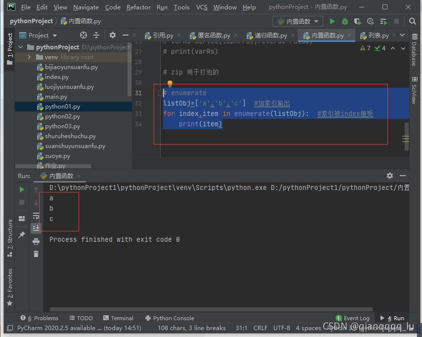 # enumerate listObj=['a','b','c'] #加索引輸出 for index,item in enumerate(listObj): #索引被index接受 print(item)