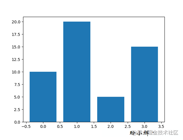 import matplotlib.pyplot as plt data = [10., 20., 5., 15.] plt.bar(range(len(data)), data) plt.show()