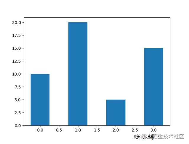 import matplotlib.pyplot as plt data = [10., 20., 5., 15.] plt.bar(range(len(data)), data, width=0.5) plt.show()