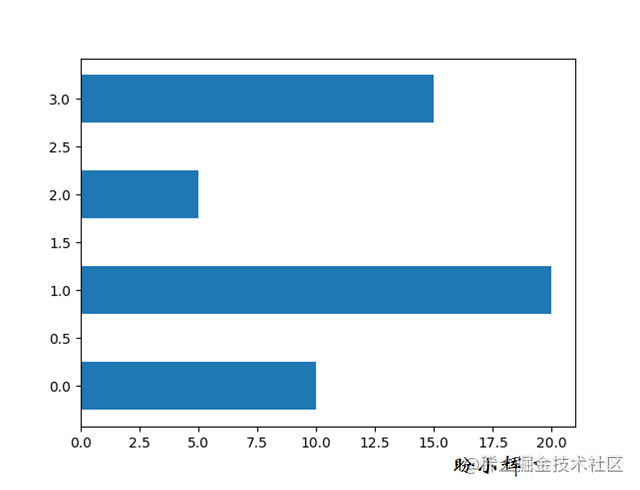 import matplotlib.pyplot as plt data = [10., 20., 5., 15.] plt.barh(range(len(data)), data, height=0.5) plt.show()