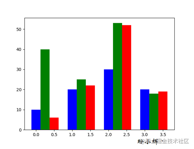 import numpy as np import matplotlib.pyplot as plt data = [[10., 20., 30., 20.],[40., 25., 53., 18.],[6., 22., 52., 19.]] x = np.arange(4) plt.bar(x + 0.00, data[0], color = 'b', width = 0.25) plt.bar(x + 0.25, data[1], color = 'g', width = 0.25) plt.bar(x + 0.50, data[2], color = 'r', width = 0.25) plt.show()