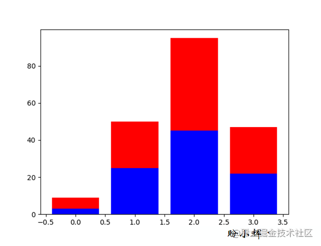 import matplotlib.pyplot as plt y_1 = [3., 25., 45., 22.] y_2 = [6., 25., 50., 25.] x = range(4) plt.bar(x, y_1, color = 'b') plt.bar(x, y_2, color = 'r', bottom = y_1) plt.show()