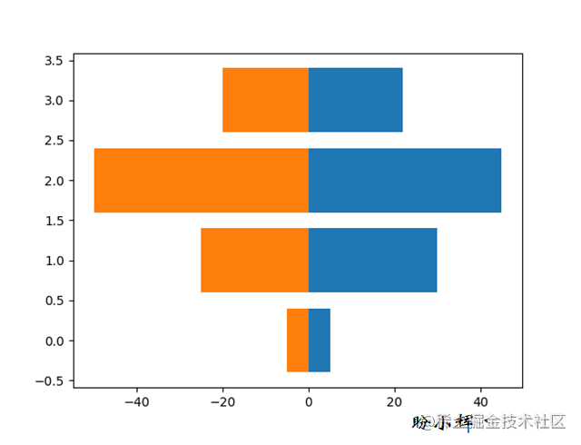 import numpy as np import matplotlib.pyplot as plt w_pop = np.array([5., 30., 45., 22.]) m_pop = np.array( [5., 25., 50., 20.]) x = np.arange(4) plt.barh(x, w_pop) plt.barh(x, -m_pop) plt.show()