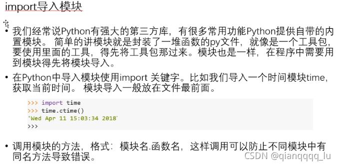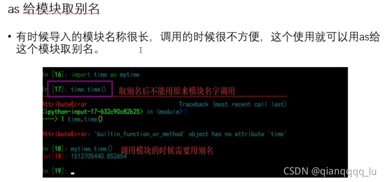 import time #導(dǎo)入的時模塊中的所有內(nèi)容 print(time.ctime()) #調(diào)用模塊中的函數(shù) # import 到首次導(dǎo)入模塊的時候,會發(fā)生如下3步操作 # 1.打開模塊文件 # 2.執(zhí)行模塊對應(yīng)的文件 將執(zhí)行過程中產(chǎn)生的名字都丟到模塊的名稱空間 # 3.在程序中會有一個模塊[可以取別名的]的名稱只想模塊的名稱空間區(qū) # 4.建立模塊時,不要與模塊名相同,否則系統(tǒng)會直接就近在文件中查找,而不是導(dǎo)入真正的模塊 # 引用格式:模塊名:函數(shù)名 可以防止不同模塊中有同名方法導(dǎo)致錯誤