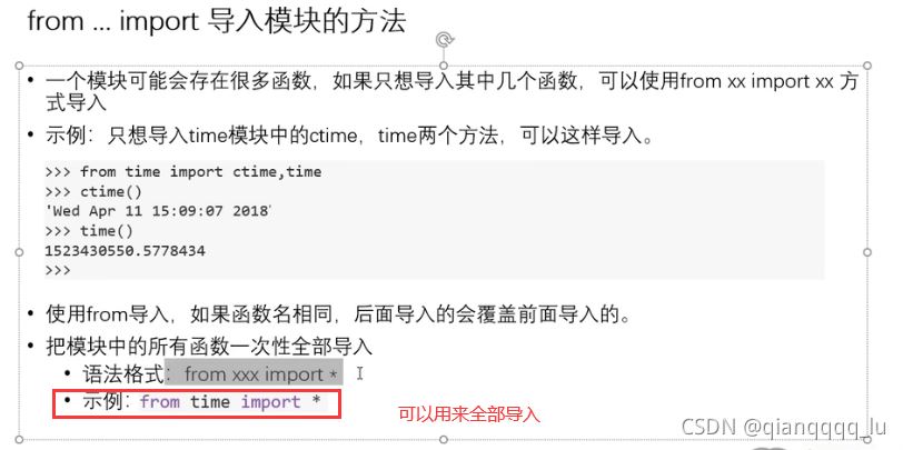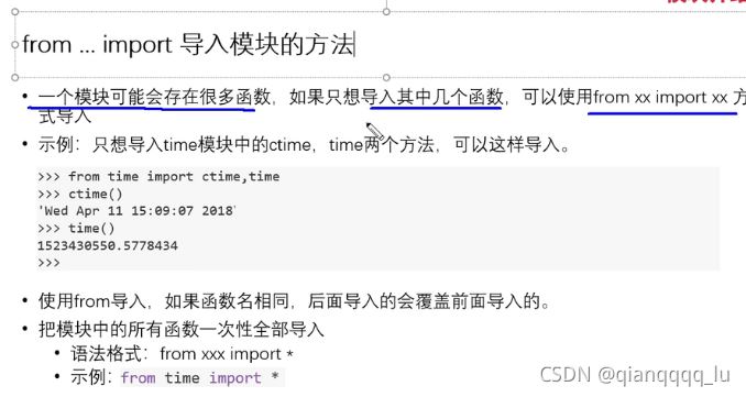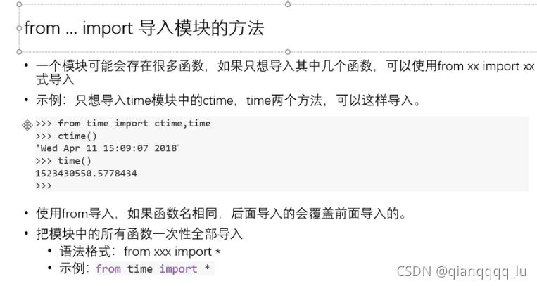 from time import ctime,time #部分導(dǎo)入 print(ctime()) # from ...import 首次導(dǎo)入發(fā)生了3個步驟 # 1 以模塊為準(zhǔn)創(chuàng)造一個模塊的名稱空間 # 2 執(zhí)行模塊對應(yīng)的文件了,將執(zhí)行過程中產(chǎn)生的名字都丟到模塊的名稱空間 # 3 在當(dāng)前執(zhí)行文件的名稱空間中拿到一個名字 該名字直接指向模塊中的 # 某一個名字,意味著可以不用加任何的前綴而直接使用了 # 優(yōu)點(diǎn):不用加前綴 代碼更加簡潔了 # 缺點(diǎn):容易與當(dāng)前執(zhí)行文件中名稱空間中的名字沖突