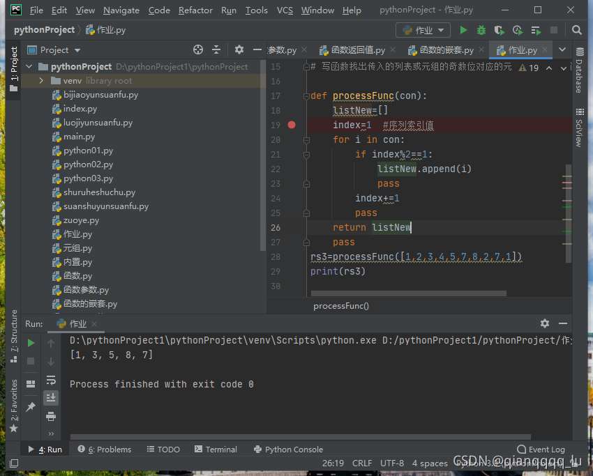 # 寫(xiě)函數(shù)找出傳入的列表或元組的奇數(shù)位對(duì)應(yīng)的元素,并返回一個(gè)新的列表 def processFunc(con): listNew=[] index=1 #序列索引值 for i in con: if index%2==1: listNew.append(i) pass index+=1 pass return listNew pass rs3=processFunc([1,2,3,4,5,7,8,2,7,1]) print(rs3)