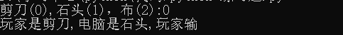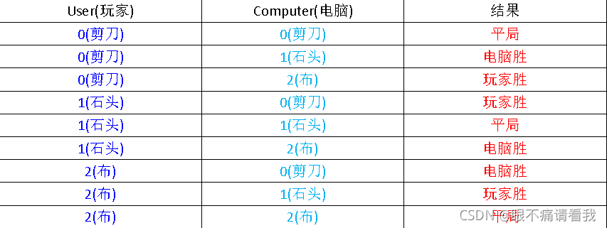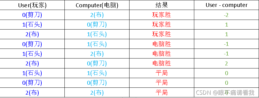 1.if user-computer == -2 or user-computer == 1 時(shí),是玩家勝出 2.if user-computer == -1 or user-computer == 2 時(shí),是電腦勝出 3.if user-computer == 0 時(shí),是平局